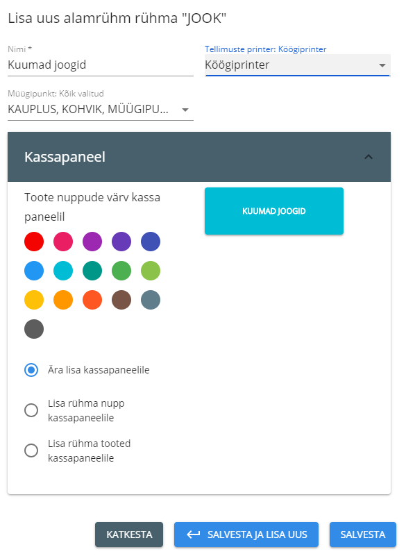 Luues uut toote alarühma saate kohe lisada sellel ka kassanupu värvi ning see värv läheb koha ka kõigile selle rühma toodetele. Hiljem saate nupuvärvi soovi korral muuta. Muidugi saate ka valida, kas soovitud kassapaneelile soovite rühmanuppu või kohe nuppe kõigi selle rühma toodetele. Kui loote uue kassapaneeli, siis saate valida, millistes kassades seda soovite kuvada. Enam ei pea tegema iga kassa jaoks eraldi paneele, kui te seda ei soovi.