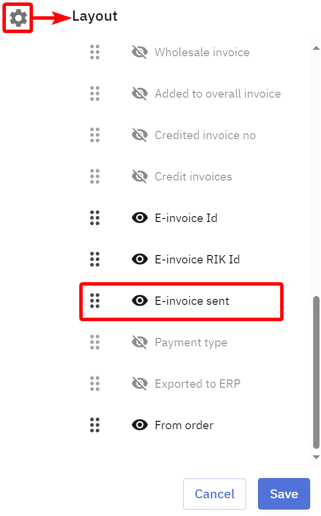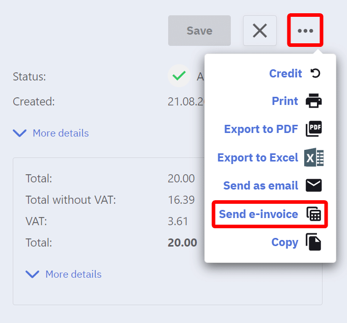 Select the invoice and click the additional options button, then choose Send e-invoice. To check if an e-invoice has already been sent to the customer, you can make the E-invoice sent field visible by clicking the Layout (gear) button on the right in the invoice list.