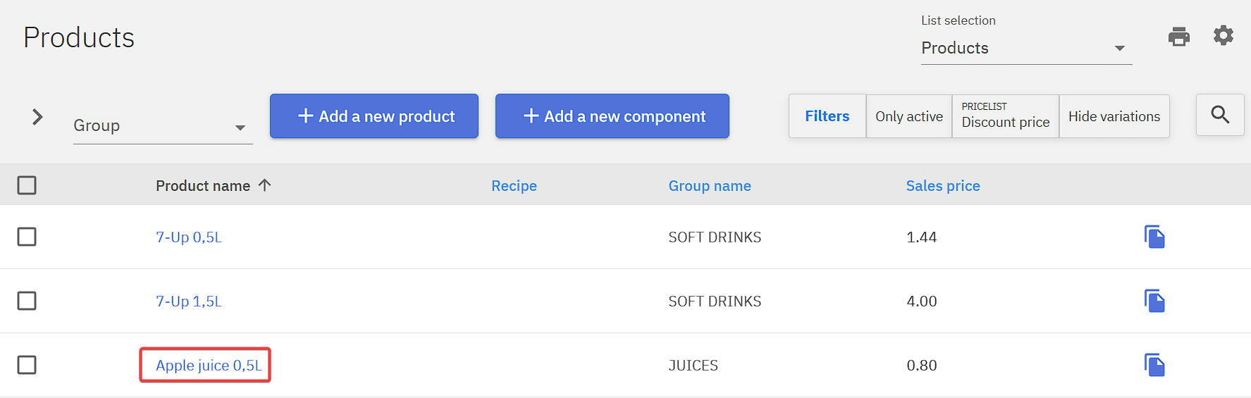 Products can be configured under product card, this can be accessed under Product management and Products, then searching for the product which is to be configured and clicking on Product name.