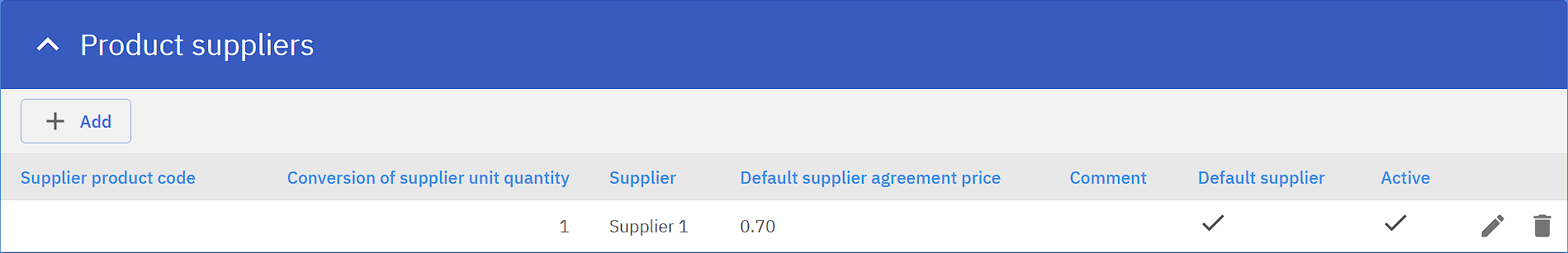 Under Product card a Product supplier for this product has to be set, if the product has been taken into the store at least once already then this supplier already exists. If no supplier exists for the product one can be added by clicking Add. In the pop-up window a supplier has to be selected.