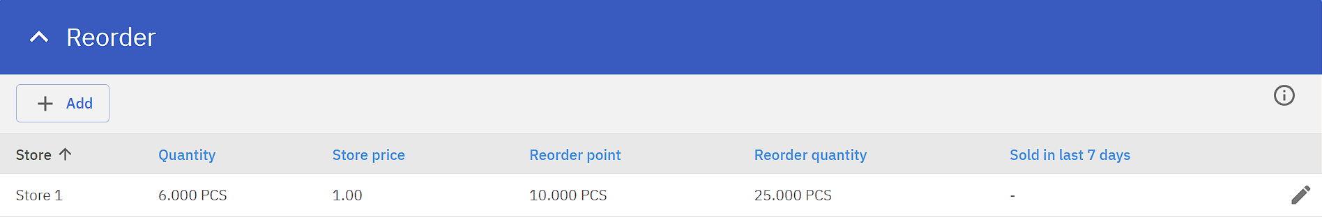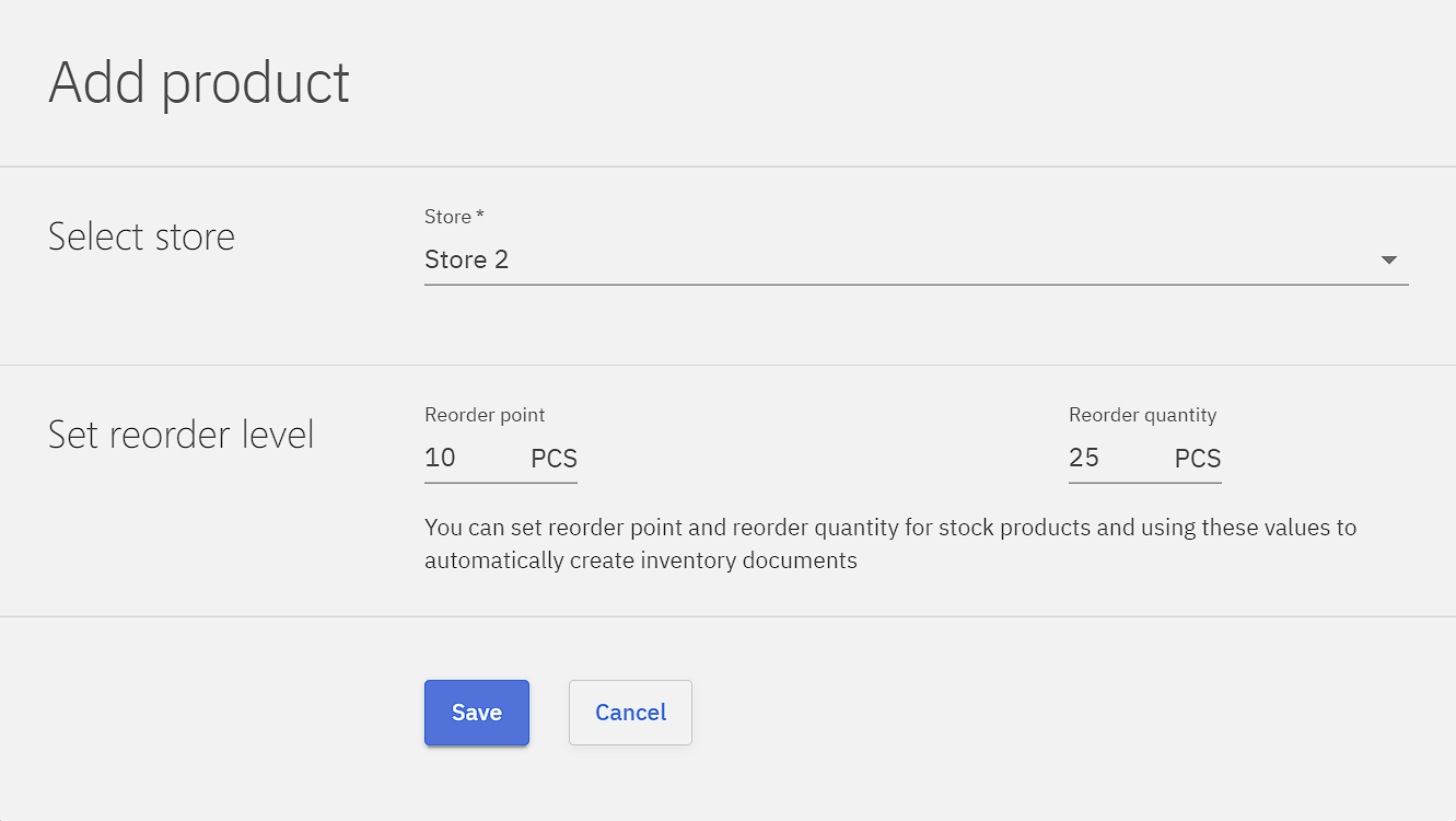 Under product card a Reorder configuration has to be set for the product. By clicking Add a pop-up configuration window will allow select the store to reorder into, set the reorder point and reorder amount for the product.