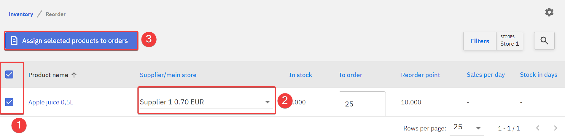 Firstly products that are to be reorder should be checked, then the suppliers for these products, after those have been set clicking Assing selected products to orders will create the orders.
