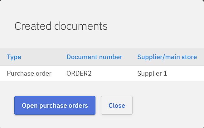 Pop-up window will show a summary of reorders created, and by clicking Open purchase orders the user will be directed to purchases.