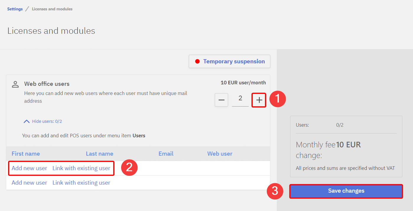 Web office users are license based, additional licenses can be added in by going Settings and Licenses and modules.