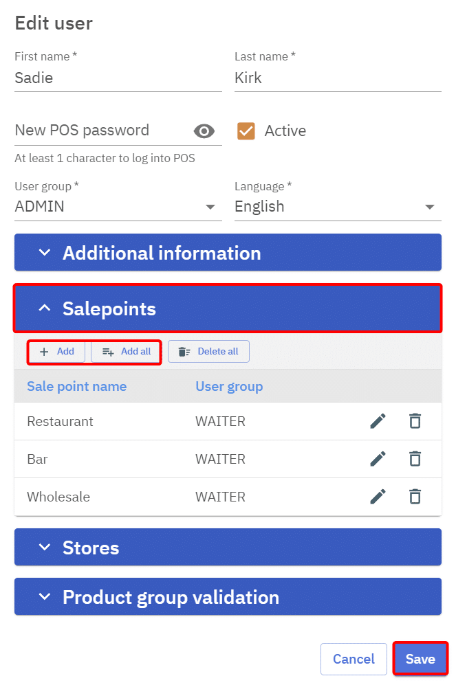 When a new sale point is added it must also be added for users, otherwise they will not be able to log into the POS at that sale point, also they will be unable to see sales/invoices in the office and configure settings related to the sale point.
