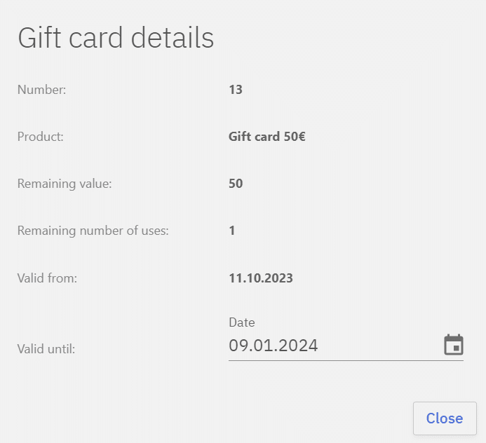 Issued gift cards in the gift cards module allows for reporting on used or unused gift cards, also the validity of existing active gift cards can be changed.