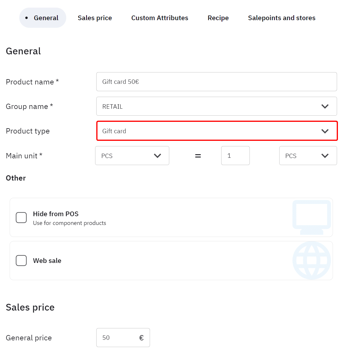 Gift card products can be created as all products under Product management and Products, the only difference when creating a gift card is setting the Product type to Gift card.