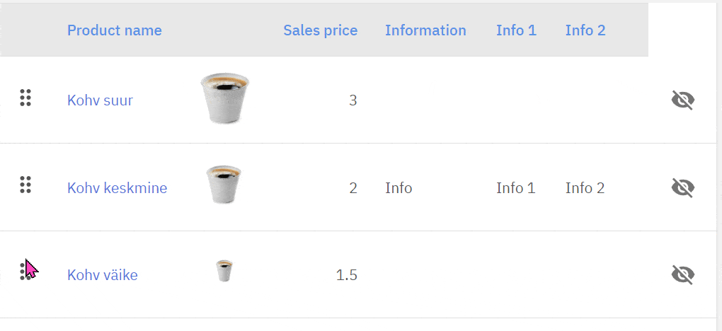 Products are displayed online in the order marked here; if you wish to change the order of categories or the order of products within categories, you can drag the rows from the 6 dots.