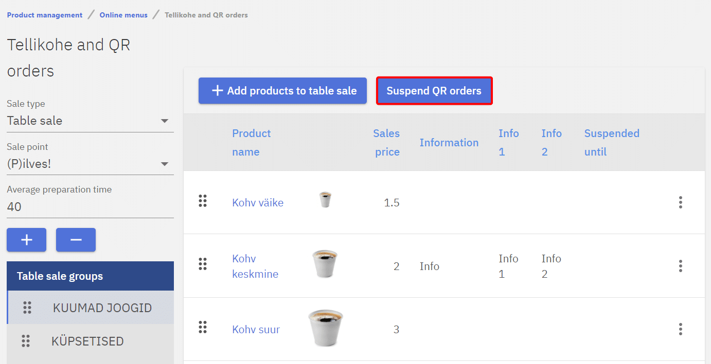 If the QR code-based table ordering solution is in use, i.e., under the sale type selection is Table Sale, it is possible to pause the ordering in the office. This should be done, for example, if incoming orders cannot be processed or there’s an error with the system. The system can be paused at the selected sales point by clicking Suspend QR orders.