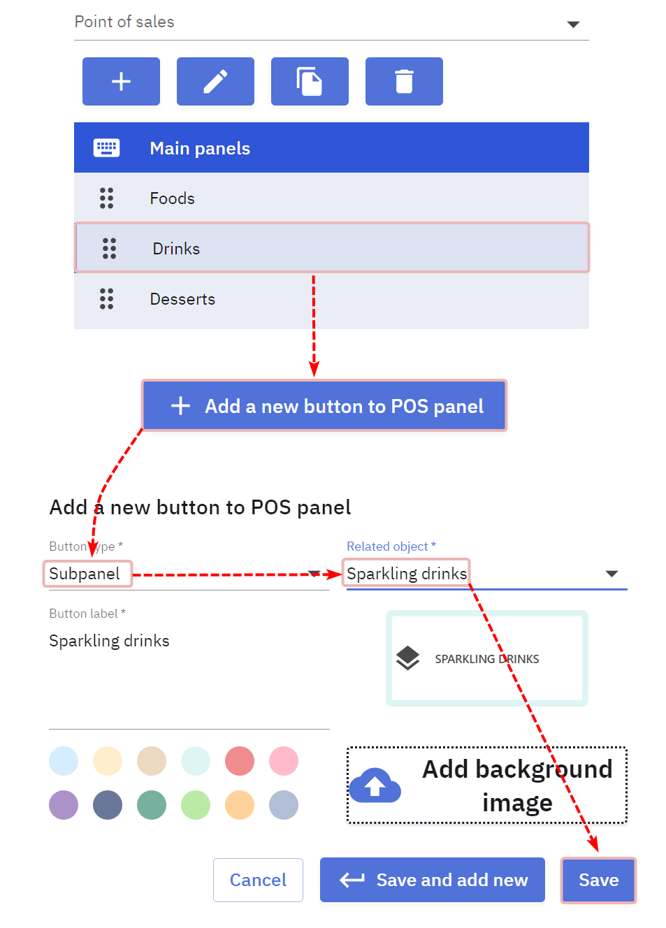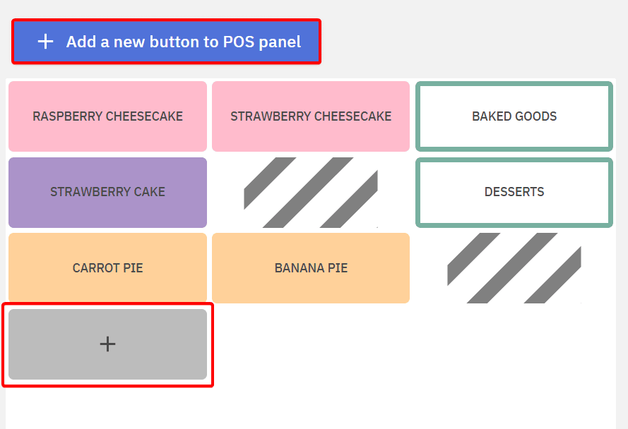 Menu to access button creation for product panels can be opened by selecting the product panel to which the button will be added, then clicking either the + or Add a new button to POS panel.