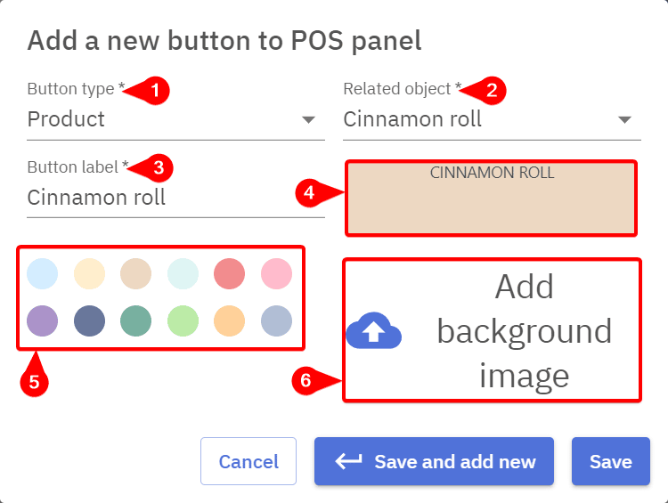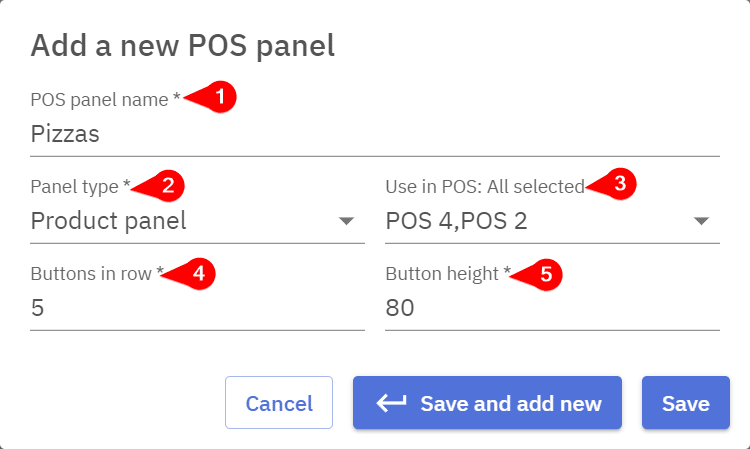 When creating a POS panel it should firstly be named(1), this name will only be displayed to the cashier and should be describe it’s contents. Panel type(2) can either be a Product panel or an Action panel. Multiple POS’ can use the same panel, and POS in which the panel will be visible has to be selected under Use in POS(3). Buttons in row(4) and Button height(5) options are only visible when creating a product panel. Buttons in row determines how many buttons can fit on one row, this depends mostly on the POS device. Phones have less screen space so it’s optimal to use 2-4 buttons in a row, tablets and computers have a larger screen and can fit more buttons in a row. Button height determines the height of each button.
