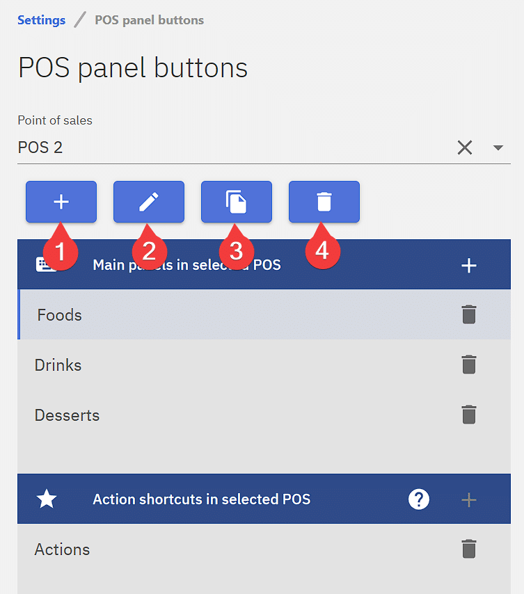 A POS panel can be created by clicking on the +(1), alternatively if panels exist in the Windows POS the copy button(3) can be used to copy them to CC5 POS. Copy button can also be used duplicate existing CC5 POS panels.The edit button (2) is for editing a selected panel and the delete(4) can be used to delete a selected panel. Deleting panels deletes all the buttons on it and the action cannot be reversed.