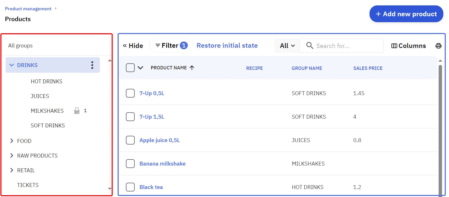 The products view is divided into two parts—on the left is the product groups view (in red), and on the right is the product list view (in blue).
