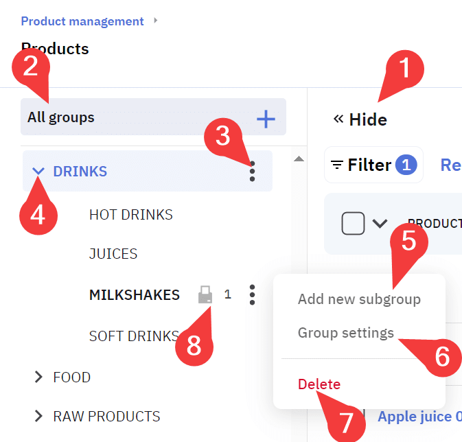 1. Allows you to close the product groups view to leave more space for the product list on the right