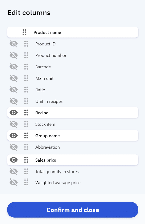 You can adjust the product table view to your preference. Click on Columns and open or close the eye icon in front of the respective information, depending on whether you want to see the column with that information on your screen or not, and in which order. Changing the order works by dragging.