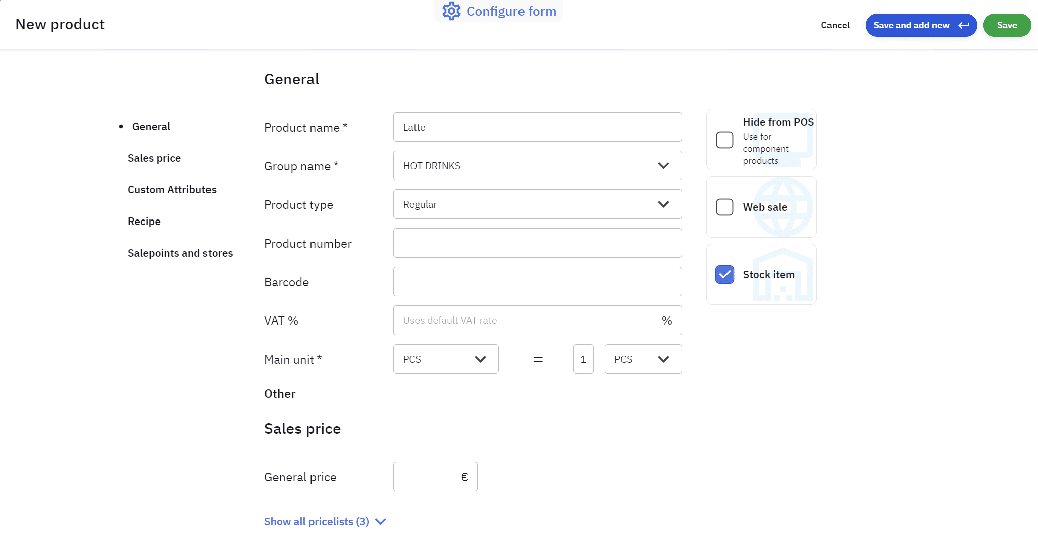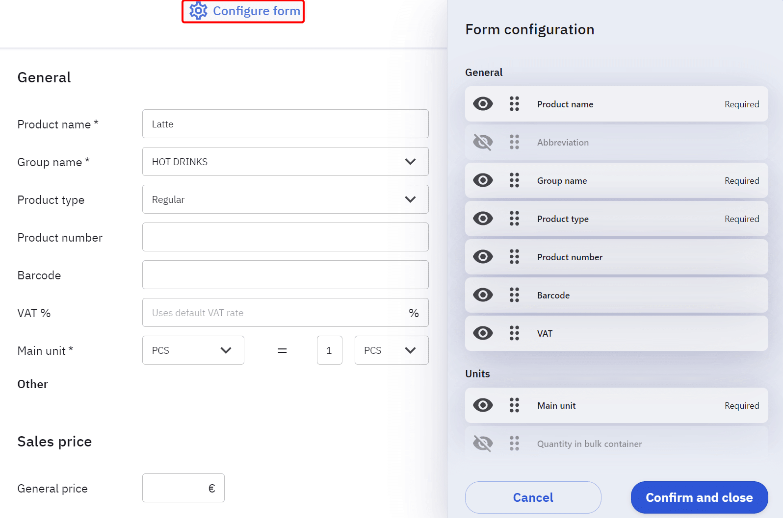 To make creating products clearer and faster, it is possible to hide unnecessary fields; for example, if the barcode function is not used, it does not need to be visible. To configure the fields, press the Configure Form button at the top center. Then a form editing window opens on the right.