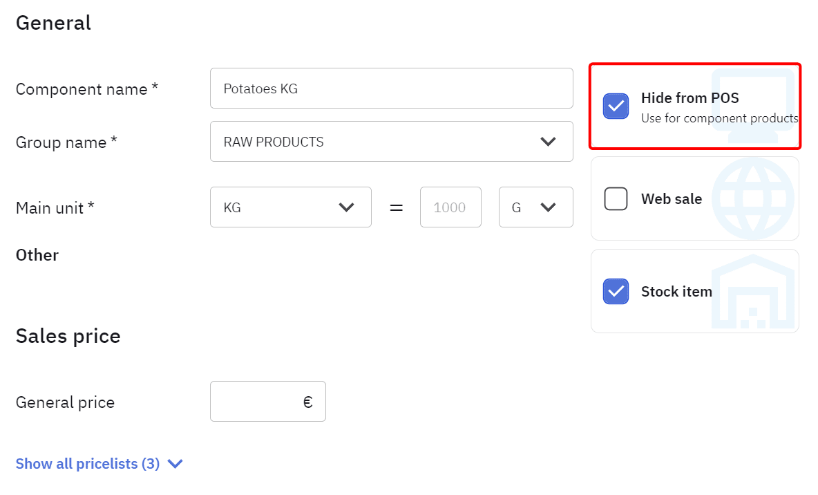 It’s most convenient to add the recipe while creating the sales product; therefore, it’s advisable to create component products beforehand. In this case, you can immediately create recipes when creating the product.