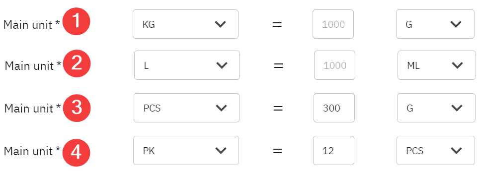 4 – Goods to stock in packages (PK), recipes use pieces (PCS), the ratio determines how many pieces (PCS) are in one package (PK), e.g., a carton of eggs; we take a carton into the warehouse, in recipes we use individual eggs