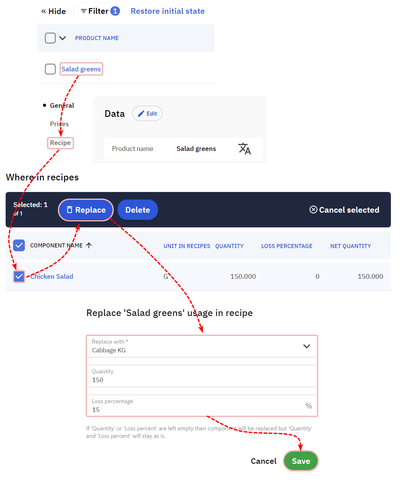 Components can be replaced and deleted in recipes on the product card, with the help of the following diagram: