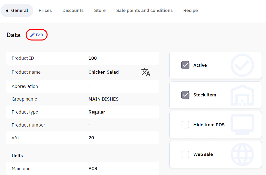 The General tab contains overall information about the product. Here you can change general information related to the product, such as whether the product is active, whether it is displayed in the POS, or how stock accounting is handled. You can modify the product information by clicking on the Edit tab.
