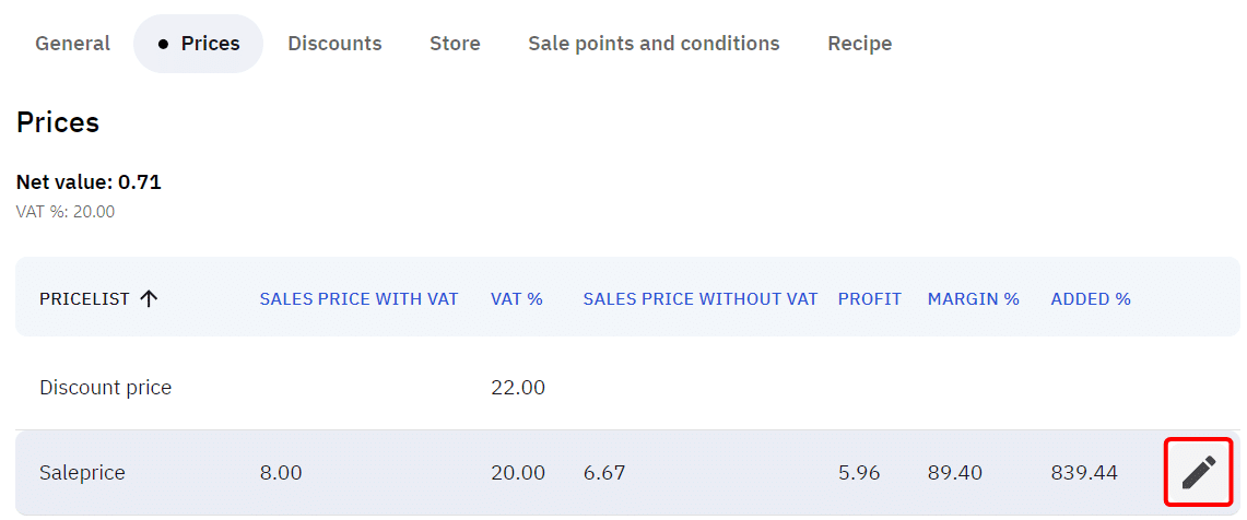 The Prices tab displays detailed price information of the product, such as the sales price or the product’s net value. In the case of a recipe product, the price per base unit is displayed. You can change sales prices by clicking the pencil icon on the price list.