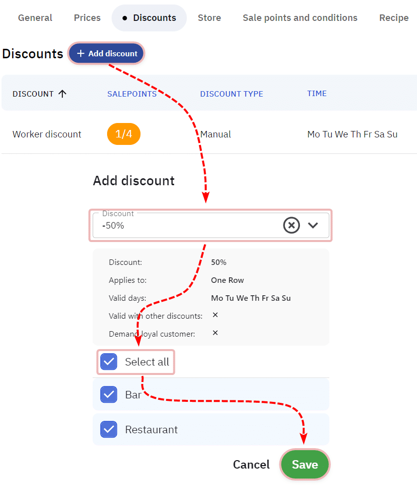 Note: Only product-specific discounts are displayed in the list. If the discount type is Applies to all products, it will not be shown in the list.