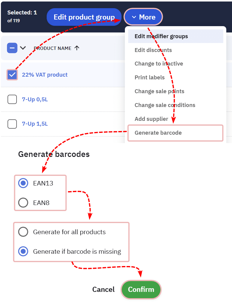 Compucash allows you to generate an EAN barcode for a product through bulk actions.