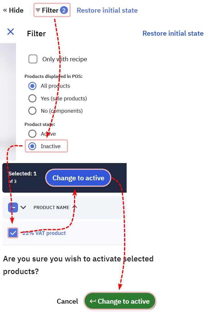 The process of activating a product is similar to deactivating it. First, you need to display inactive products using the filter; then you can select them and activate by clicking the Activate button.