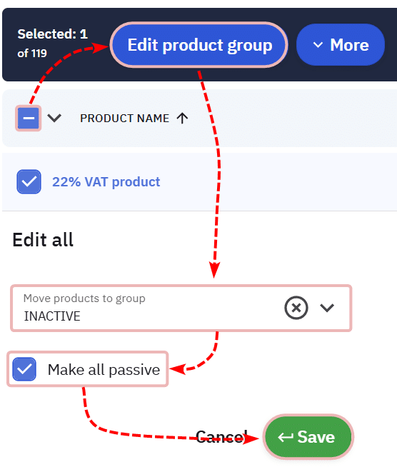 Select the products, click Change Product Group, choose the product group created for inactive products, and check the box Deactivate All. Then all selected products are moved to a separate product group and deactivated.