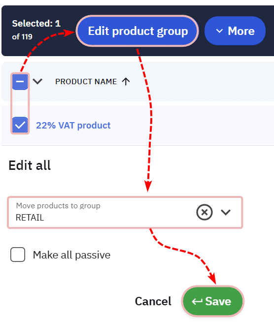 In the product list, you can perform various bulk actions with products. By checking the products and clicking the Change Product Group button, you can move products between groups. Additional options are under the More button.