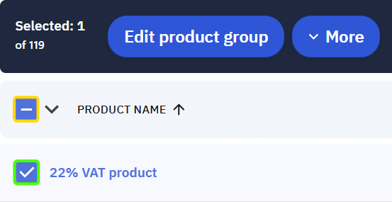 By checking the top box (yellow), all products are selected. By checking the box before the product name (green), only that product is added to the selection.