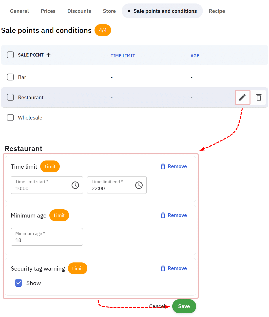 This tab displays information about sales points. If more than one sales point is used, you can configure in which sales points the product is sold. In addition to the sales point, you can add sales restrictions to the product here.