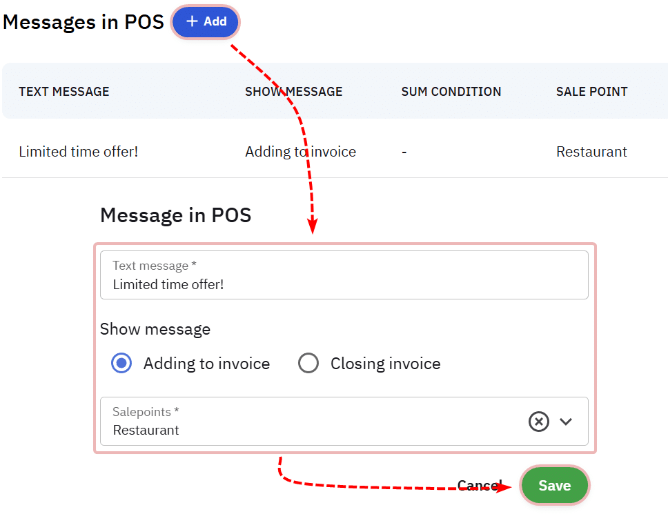 Finally, you can set messages for products that are displayed according to the settings either when the product is added to the invoice or when the invoice is completed.