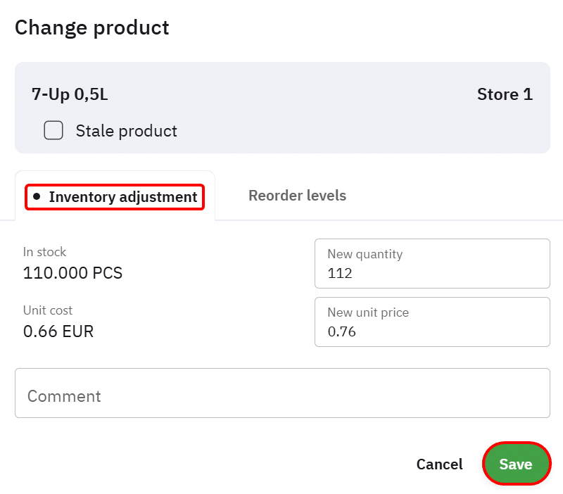 Note: Adjusting the stock level creates an inventory with the current stock time, which may prevent general inventories from being made! If a general inventory has been counted but not yet entered, you must enter that inventory before adjusting a single product!