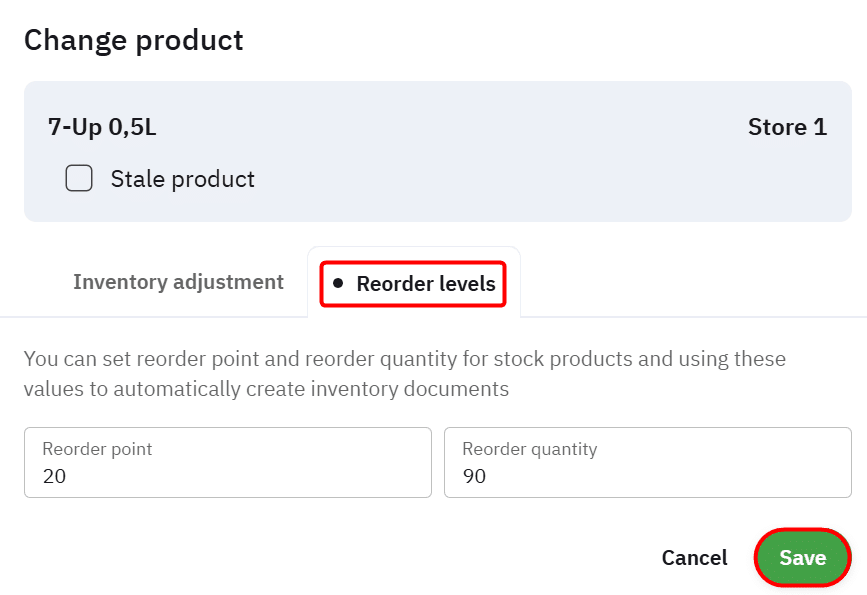 Under Reorder Limits, you can set lower limits for products, which allows you to easily create a delivery note to reorder the product.