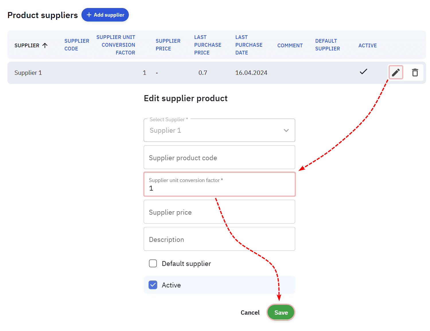 In addition to the stock level, you can manage supplier relations on the Stock page. This is useful, for example, if you are using Telema or another electronic delivery note interface and an error is made in creating the supplier relation.