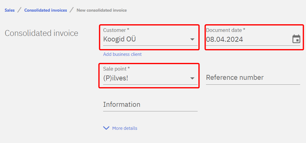 A new consolidated invoice can be created by clicking New consolidated invoice. Afterwards the Customer, Document date and Sale point must be selected.