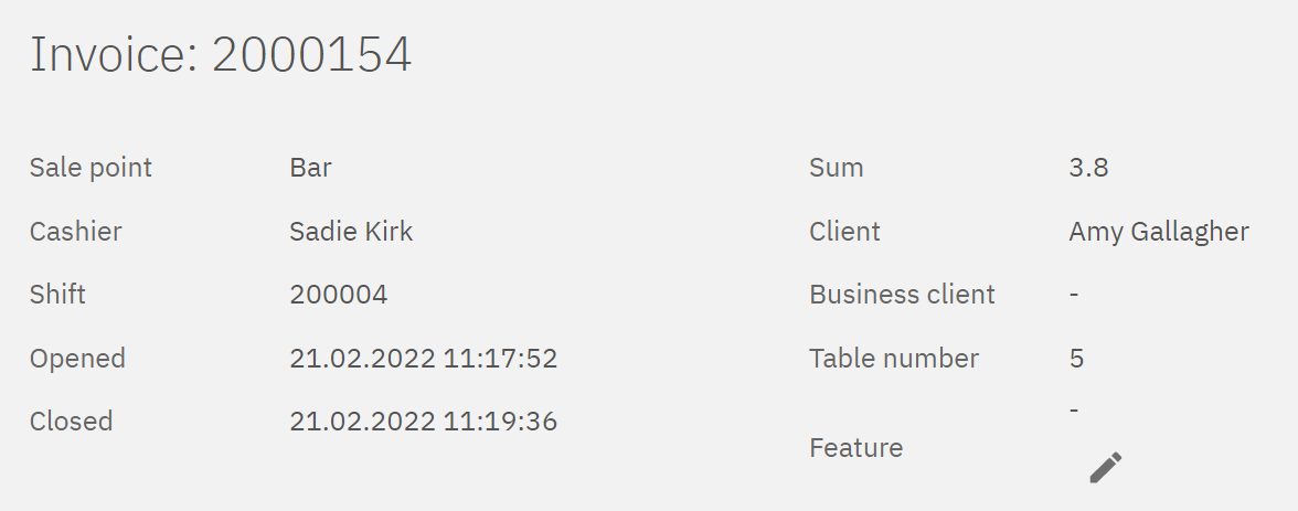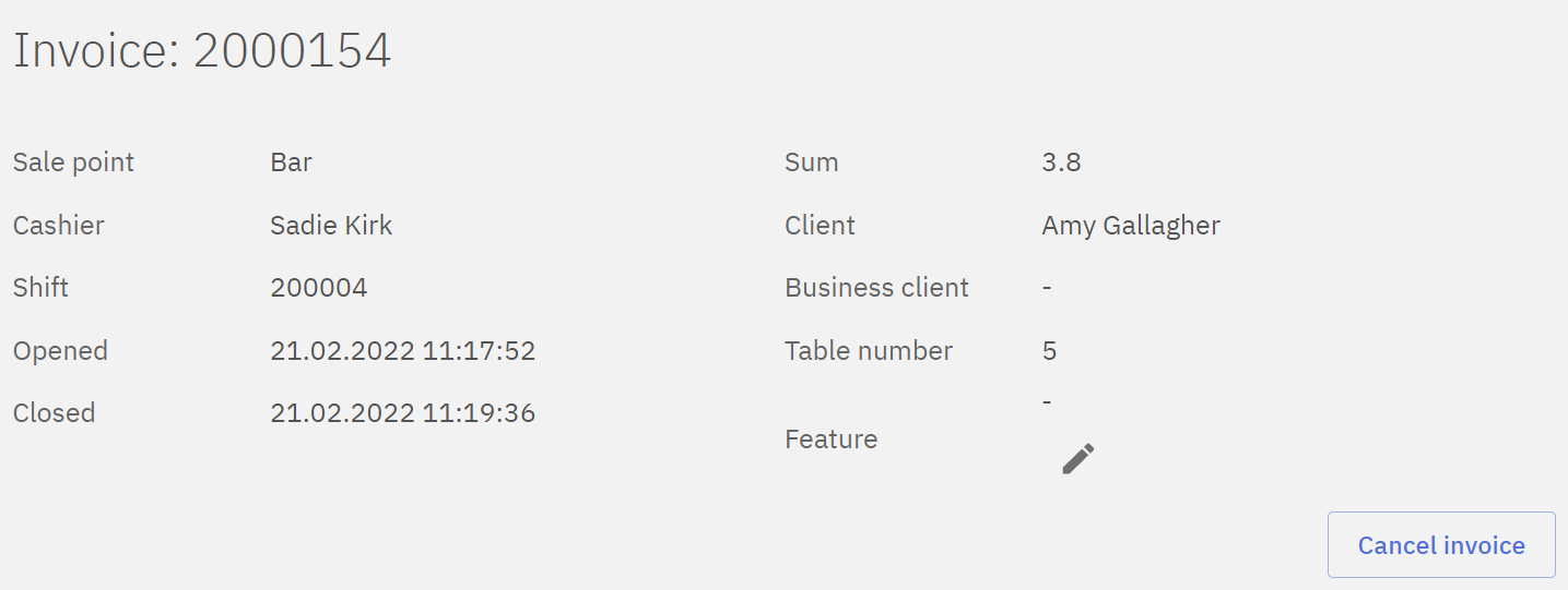 When opening the invoice some general information is displayed, such as the cashier, the sale point in which the invoice was created and the sum.