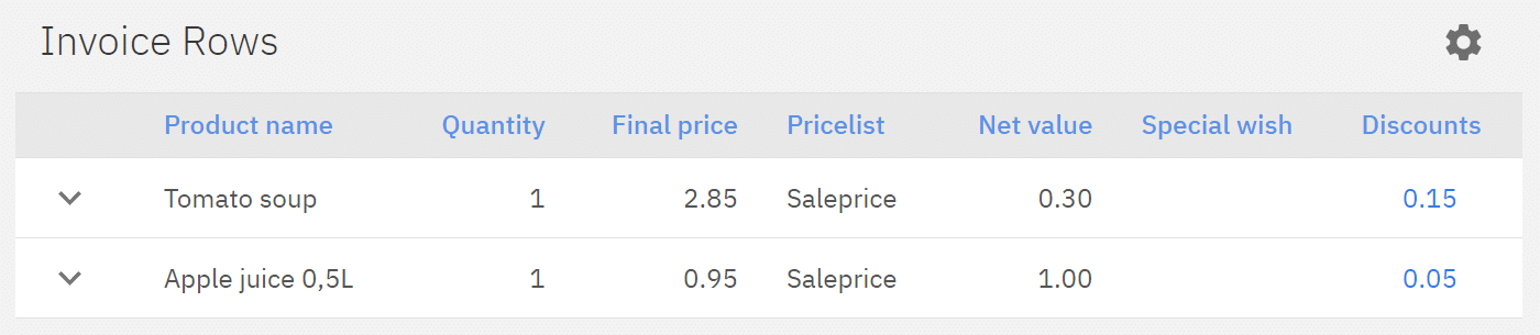 Products on the invoice are displayed under invoice rows. This includes information such as the price they were sold at and also discount sum if a discount was applied to that row. By hovering on the discount sum a tooltip will display which discount was applied. If the sold product was a recipe movements of the components can be expanded by clicking on the downwards pointing arrow.