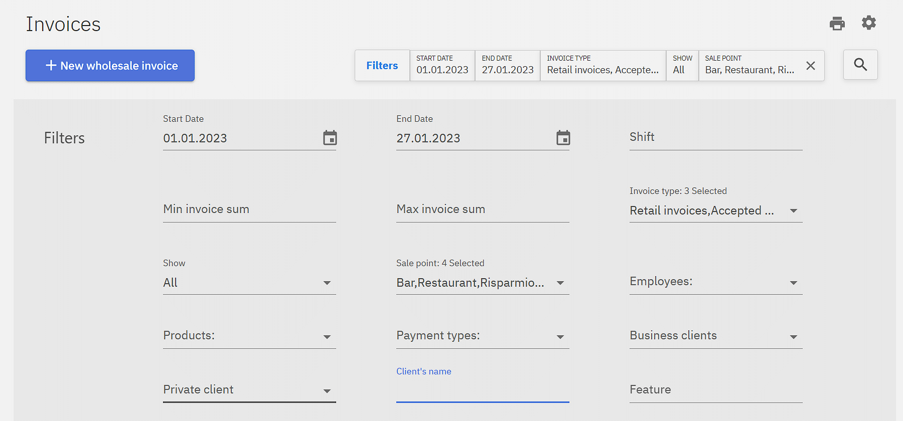 Invoices in invoice registry can be filtered by different parameters, such as employee who created it, products that are on it or by how the invoice was paid for. In addition there’s an option to filter only wholesale invoices or only retail invoices.