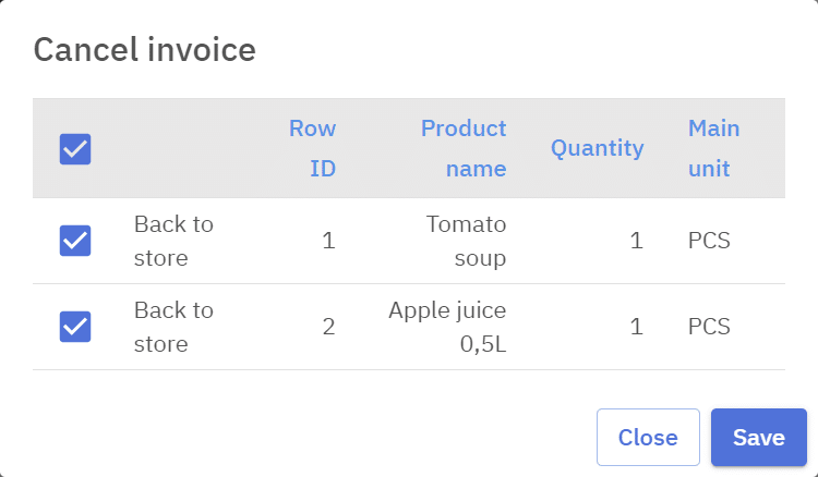 By default the products will be sent back to the store, if for some reason the products shouldn’t be sent back to the store(e.g. the recipe has already been made) the box has to be unchecked. Clicking Save will cancel the invoice.