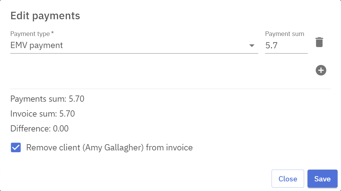 Payments can be edited by clicking on Edit payments. This is useful for when the invoice was closed incorrectly or there was an error with payments. An extra payment type can be added by clicking +, then entering the sum.