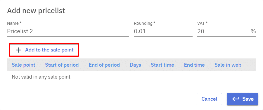 This will open up a configuration window for a new pricelist. Here a name, rounding and VAT for the pricelist can be assigned. If the pricelist will be used with discounts adding it to a salepoint is not necessary, however if it will be used in a salepoint as a pricelist for a POS the salepoint has to be added. Adding the salpoint can be done by clicking the “Add to the sale point” button.