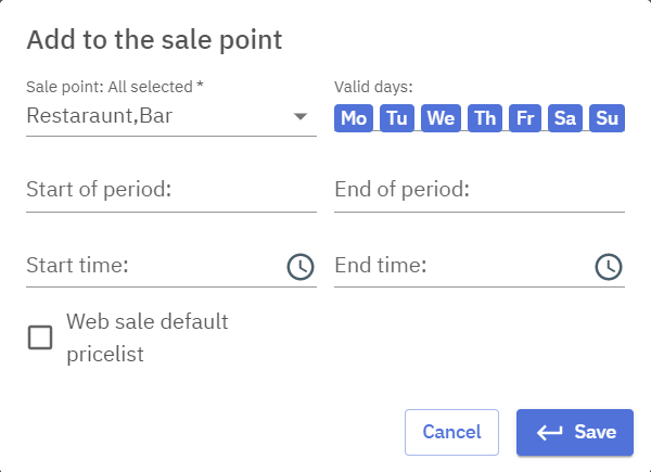 In the salepoint configuration the salepoint which is to use the created pricelist has to be selected, also the pricelist can be set to be active only at certain times, like weekend nights. Days marked blue are days which the pricelist is active, by clicking on the day it’s possible to unmark it. A pricelist can also be configured to be active for only a certain period of time. Additionally if the pricelist is to be used in sales through the web it should be set as default for it. After the configuration is set saving it will create a new pricelist.