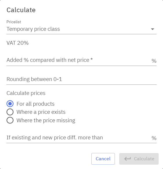 Calcuating is a quick way of adding prices to products based on their net price. Net price of the product will be the calculated average of all self prices that product has in different stores. By clicking the “Calculate” button a calculation window will pop up.