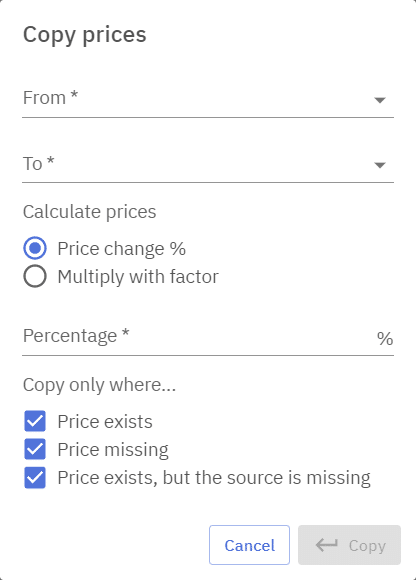 Copying prices functionality can be used to copy prices from one pricelist to another or increase/decrease prices in a pricelist by a specific percentage point.