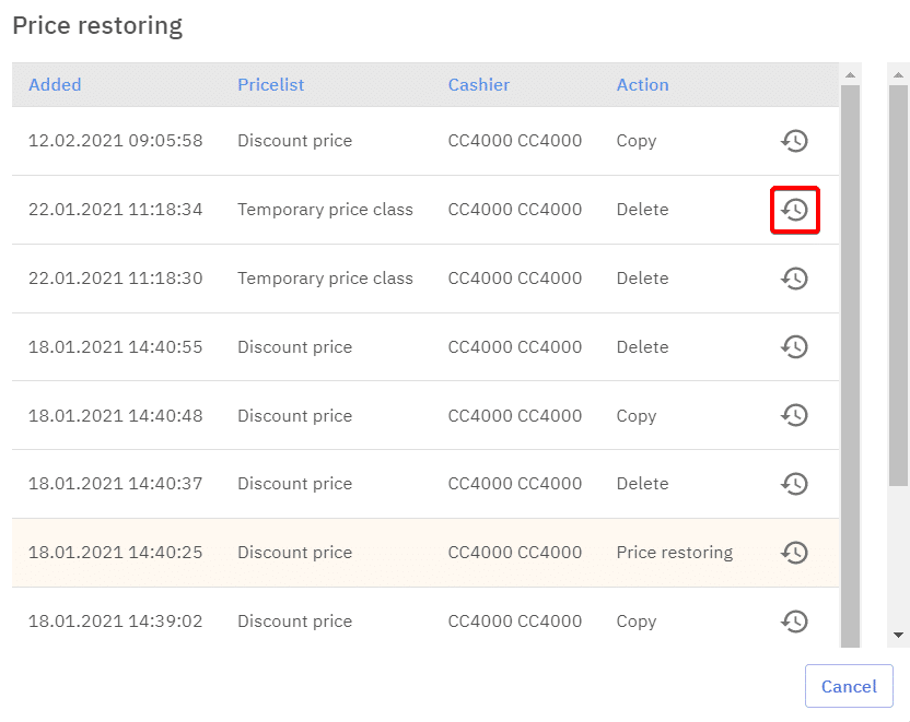 Most recent bulk actions are displayed along with the date and the user. Target pricelist can be restored by clicking on the clock and confirming the action. This will also reverse all single changes done to the pricelist after the bulk action.