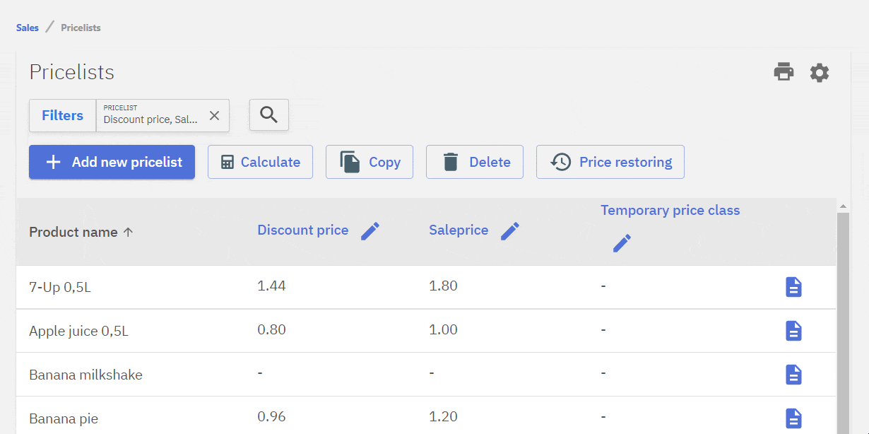 Prices can be added and edited by searching for a product and moving the cursor on the price field of a desired pricelist.