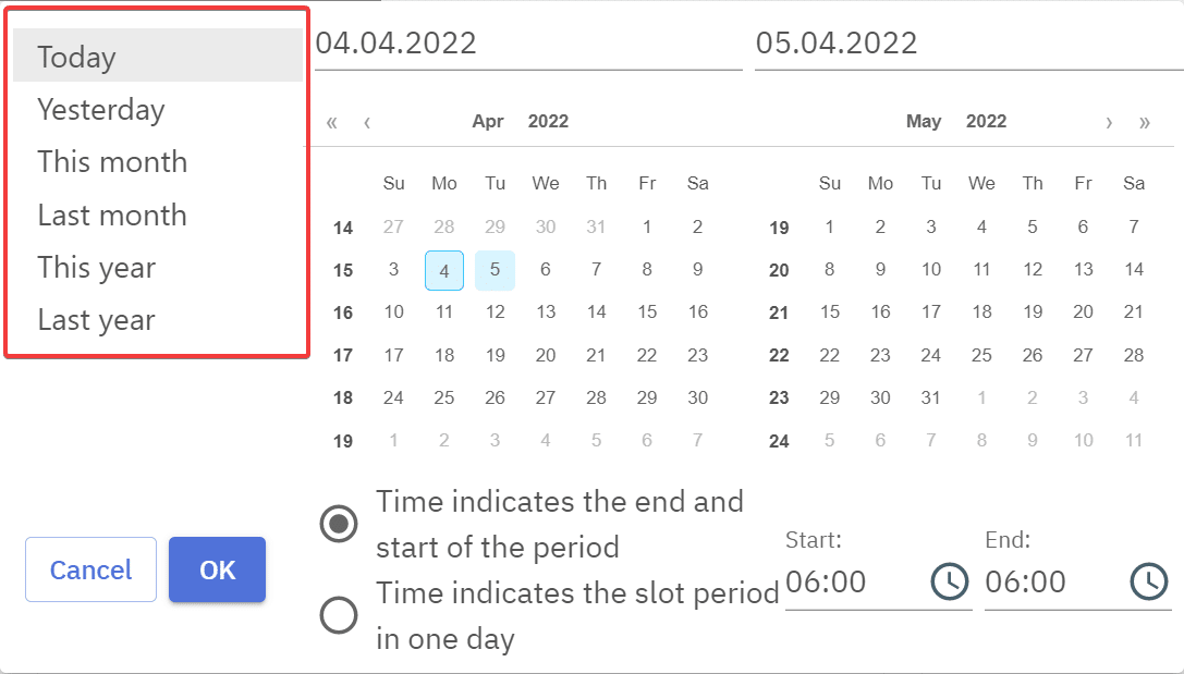 Selecting a specific period can be done by clicking on start date and then clicking on the end date. By default the time is set as the start of the begin date and end of the end date. To see a report for an exact time period over selected dates e.g. from 8 o’clock from 10 o’clock over a period of a month, “Time indicates the slot period in one day” has to be selected.