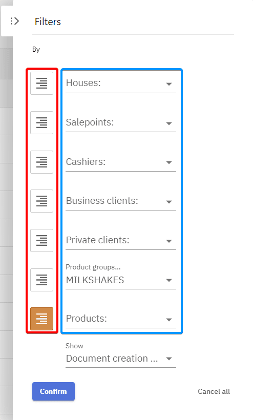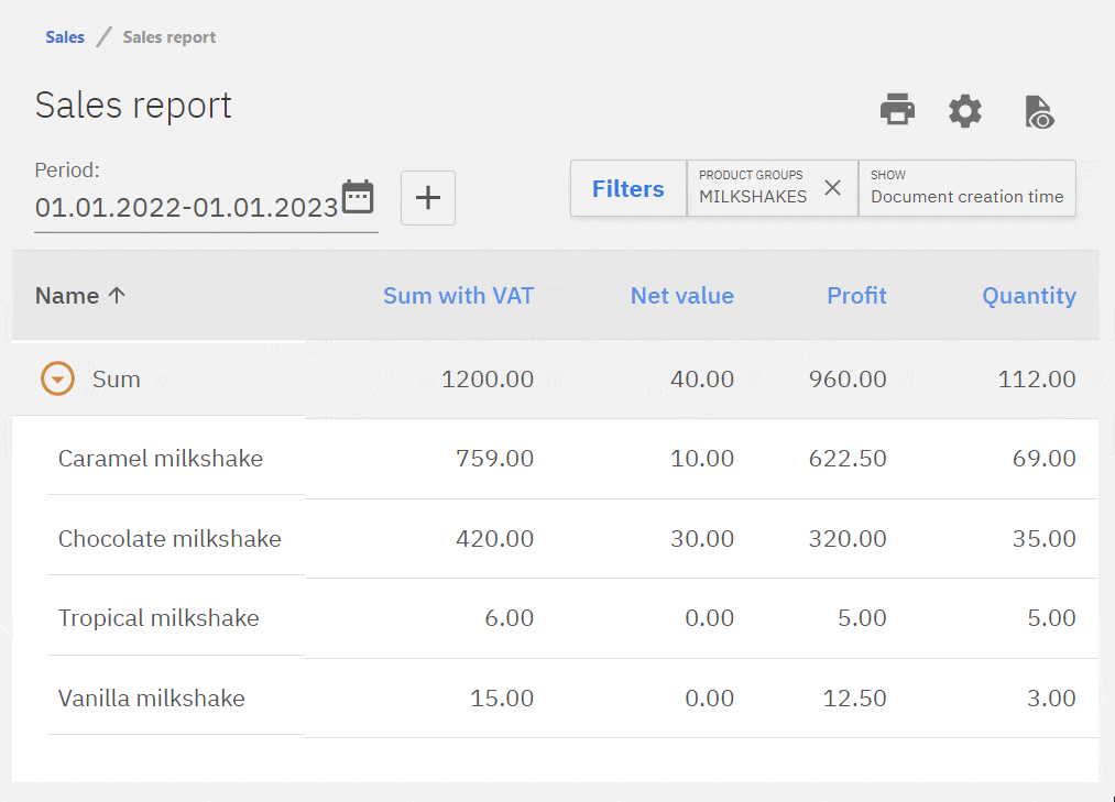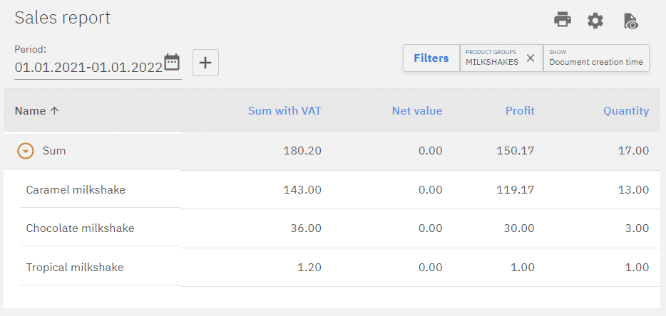 To filter result different options outlined in blue can be selected, outlined in red is grouping functions. As displayed in the image the report would be filtered to only include sales of the products under Milkshakes product group and the results would be grouped or listed by product name.